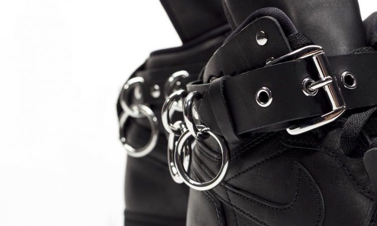 超长的鞋舌设计和超大环扣铆钉设计,让人印象深刻。搭配皮质绑带和金属链条,还呈现出了满满的朋克风。